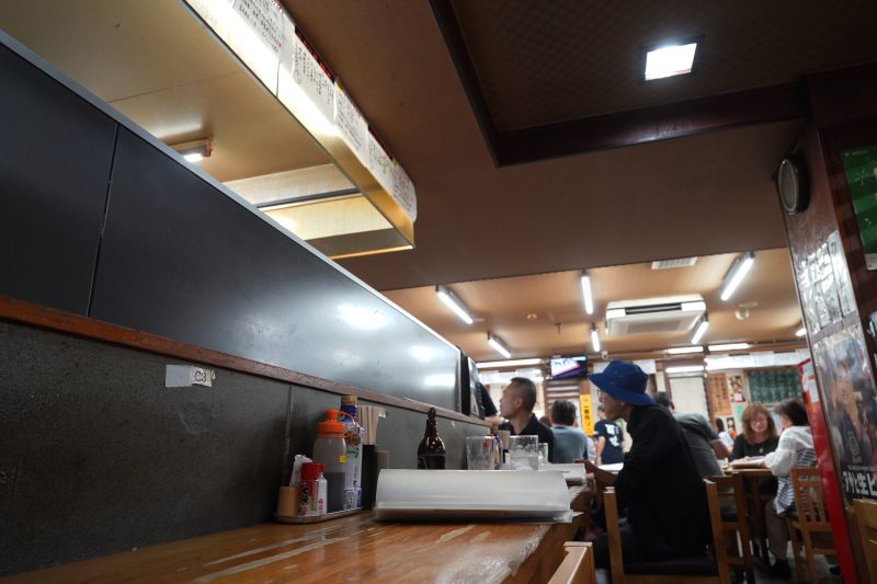 地下への階段を降り暖簾をかき分けると、さすがは名店、さすがは休日の夕方、これぞ酒場といった盛り上がりを見せている。テーブル席、小上がり席、そしてカウンター席が、人と酒で埋め尽くされている。店員にひとりであることを告げると、奥まったカウンター席へ案内された。盛り上がる酒場の、比較的静かなカウンター席。ひとり客にとってはありがたいポジションだ。希望にかなう席に座れたというだけで、酒呑みのテンションは格段に上がっていく。酒と酔いに向き合う万全の体勢が整ったとでも言うかのように。
