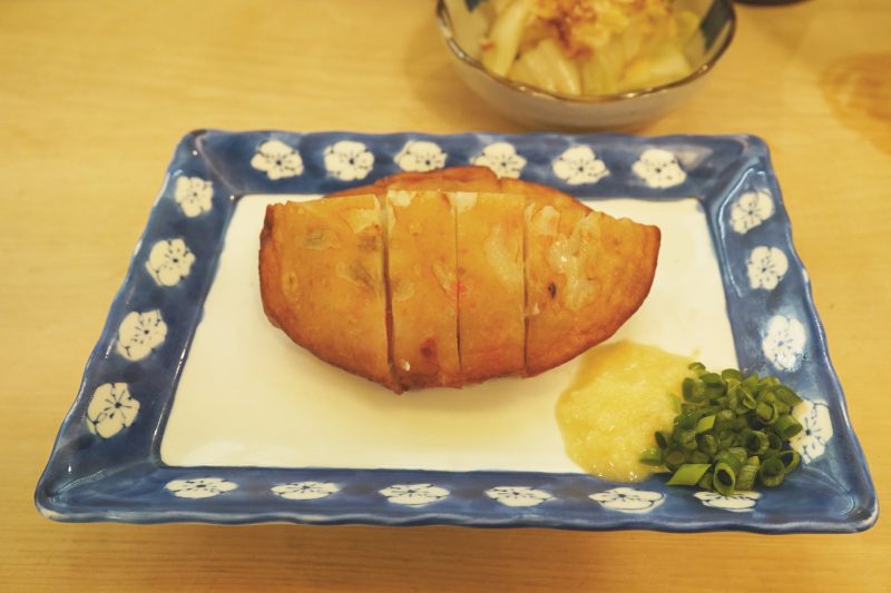 しばらくしてやってきたのは、さつま揚。添えられた生姜にすこし醤油をたらしていただく。熱々でほくほく、魚の旨味がしっかりと伝わってきて小さく感動するレベルで美味しい。普通の酒場であれば業務用のさつま揚げを温めて提供することが多いはずだけど、これはお店で手作りしてるんじゃないか、と思わせる一品。今度行ったら恐る恐るおねえさまに聞いてみようかしら。