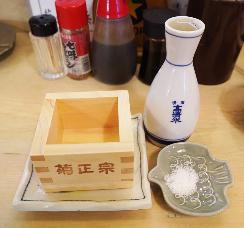 ビールとおつまみをひととおり楽しんだところで、お待ちかねの日本酒タイムへ。樽酒の高清水がやってきた。菊正宗の枡とおまけの塩もついている。樽酒の香り高さに枡の香りもプラスされ、もう一口ひとくちが至福。
