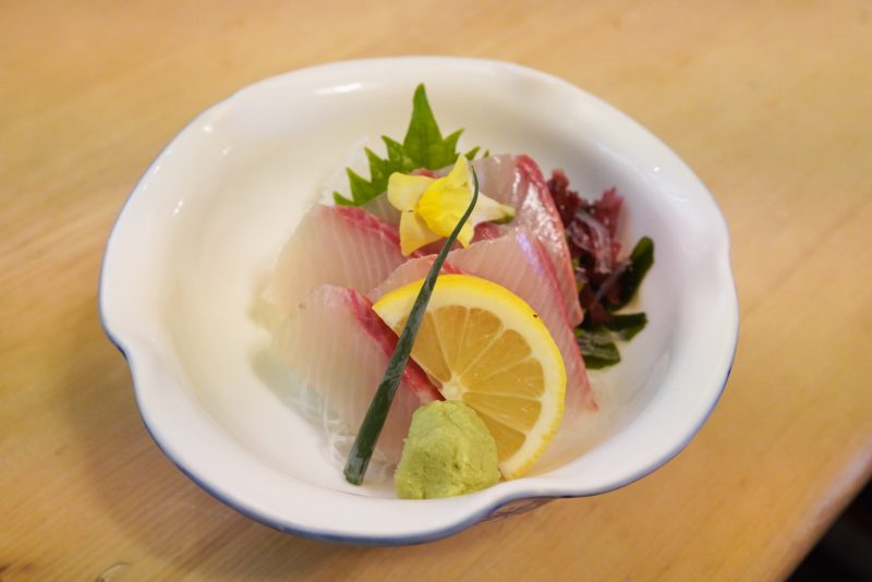 日本酒に合わせるべくオーダーしたカンパチの刺身。盛り付けの美しさにまず感動。この日は(たしか)日曜日で、豊洲市場は閉まっているはずだからお刺身にそこまで期待できないかな、とは思っていた。しかしこのカンパチはしっかりと脂が乗っていて美味しい。樽酒の高清水と交互に味わい、この上ない酒宴とすることができた。