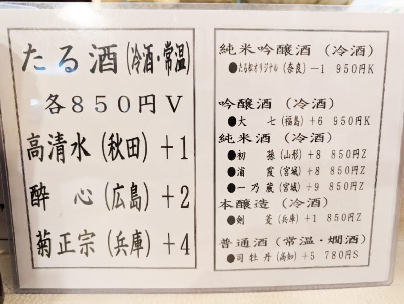 さっそく手元のお品書きを眺める。やはり日本酒のラインナップは豊富で、たる酒や純米吟醸酒、吟醸酒、純米酒などにカテゴリー分けされ、さらに日本酒度まで記されているためとても参考になる。価格横に記されているV、K、Z、Sに関しては不明だが、同じアルファベットのものが同価格なので会計上必要な記号なのだろうと勝手に解釈。兎にも角にもしっかりと吟味して日本酒を楽しもう。