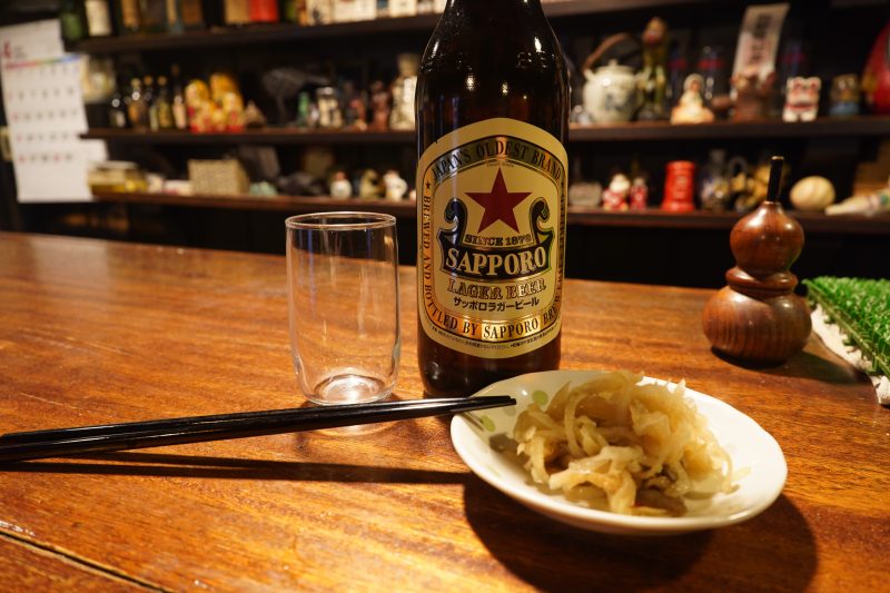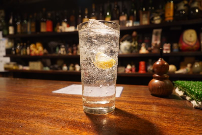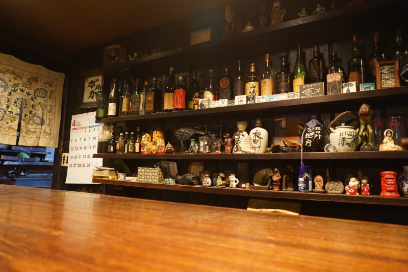 店内の装いは、例えるならば古い山小屋といったところだろうか。黒く塗られた木材が使われているのか、はたまた長年にわたる使用によって黒ずんでしまった木材なのかはわからないが、とにかくダークな木調の空間が広がっている。照明もカウンターや各テーブルなど要所にのみ据えられているため、店内の暗さがさらに際立つかたちとなっている。案内されたカウンターの正面には、酒瓶やグラス、置物の類が幾重にも並べられている。酒瓶の中のお酒は誰かがキープしたものなのだろうか。かなり年季が入っているものも見受けられる。置物のなかには著名な文化人が海外へ取材に行った土産として置いていったものがあるのかもしれない、などと考えると自分勝手な感慨深さを感じることもできる。