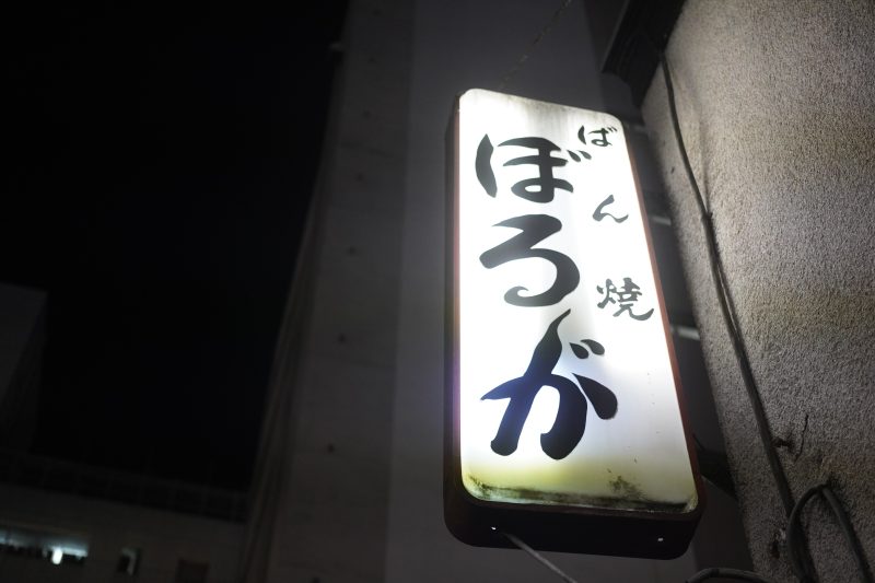 酎ハイとおしんこでさらにこの店を味わいつつ、客が増えてきたこともあって程なく店を後にした。あたりはすっかり暗くなり「ぼるが」と記された看板にも光が灯っていた。名だたる文化人たちもさんざん呑んだ挙げ句に、今の私と同じようにこの看板を見上げていたことだろう。何か特別な体験があったわけでもないのだが、ちょっと忘れがたい酒場体験となったことは言うまでもない。